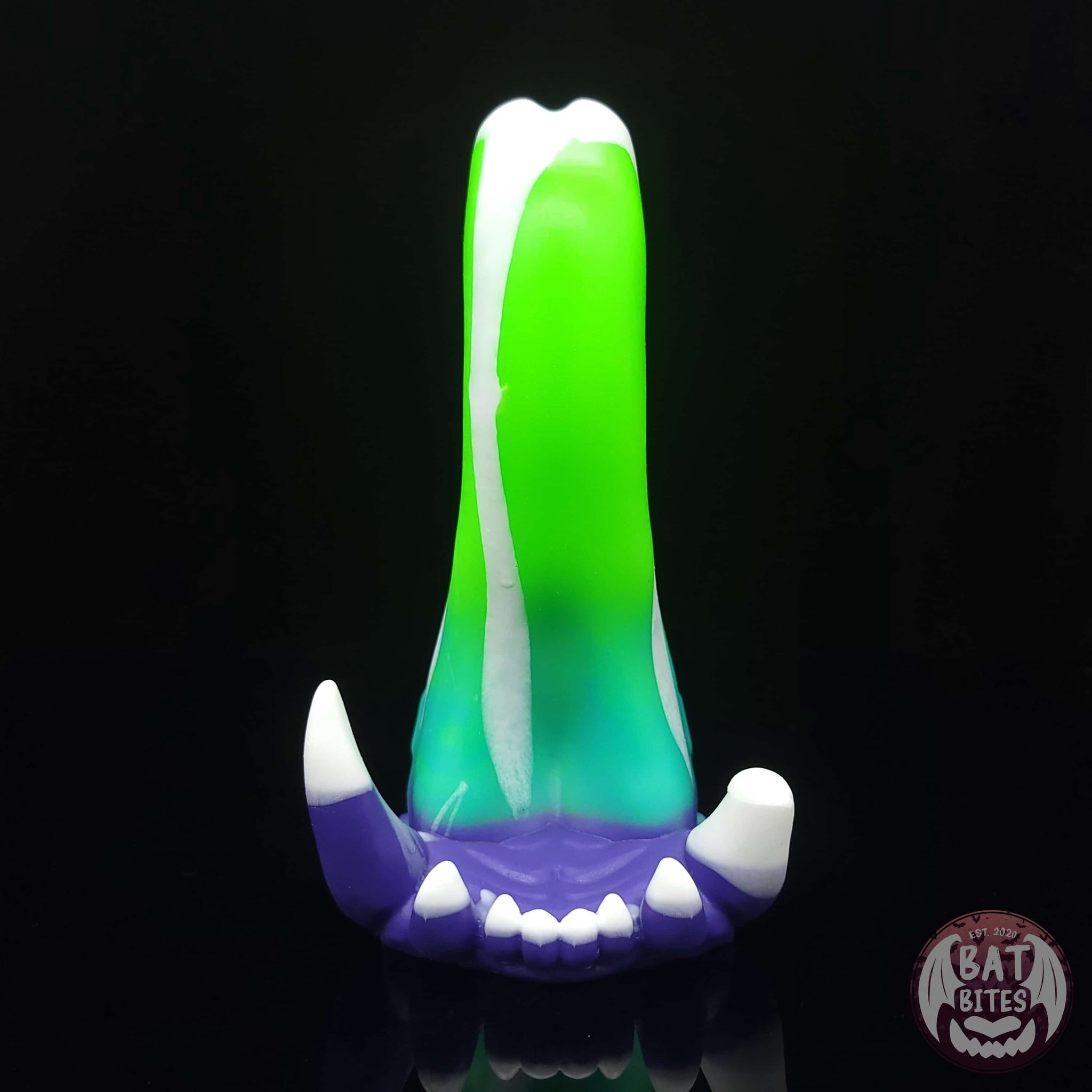 Even though she may be made of stone, Spire is surprisingly soft! Her smooth gently curved tongue rests upon a mess of long sharp fangs. Subtle nubs and a textured underside make for a unique ride.